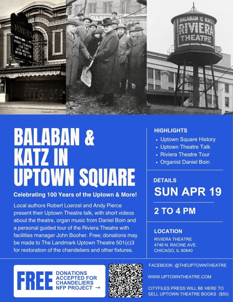 Celebrating 100 years and keeping the momentum of the effort to restore the Uptown Theatre alive... Join us at 2 p.m. Sunday, April 19, for a fun-filled time in the auditorium of the Uptown's older sister, the historic Riviera Theatre. Local authors Robert Loerzel and Andy Pierce will present their Uptown Theatre talk with short videos and a book signing. Daniel Boin’s organ music will set a 1920s feel while Uptown's own Dave Syfczak will add historical insights. A special Thank You to Jam Productions for the use of the Riviera Theatre and to John Booher, the Facilities Manager, for providing his legendary Riviera Theatre Tour. The Landmark Uptown Theatre 501(c)3 is accepts donations for retrieving and restoring the Uptown Theatre's original Victor S. Pearlman chandeliers and other light fixtures. We provide advocacy and provide opportunities for those who share the interest to gather for community.